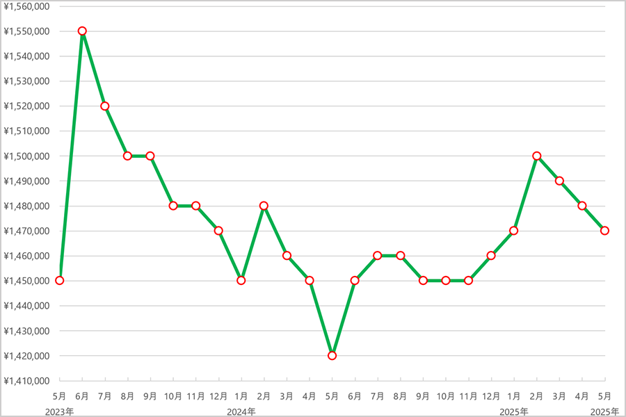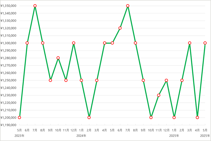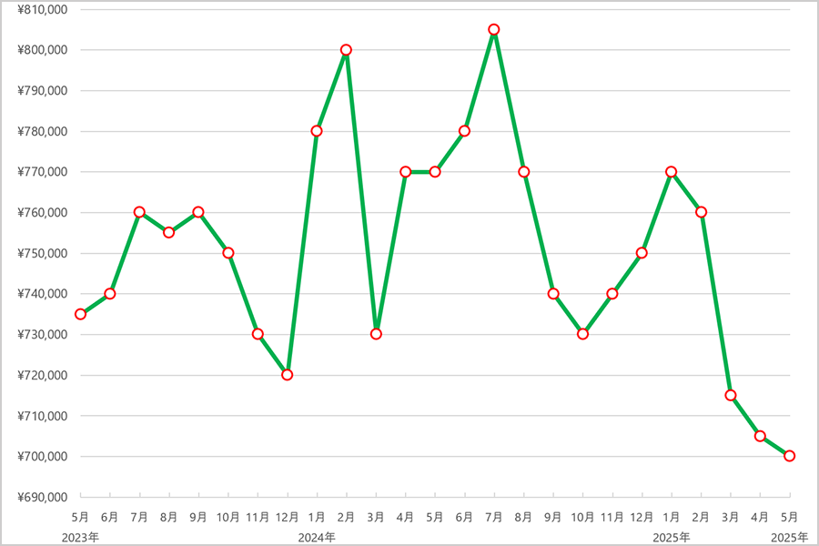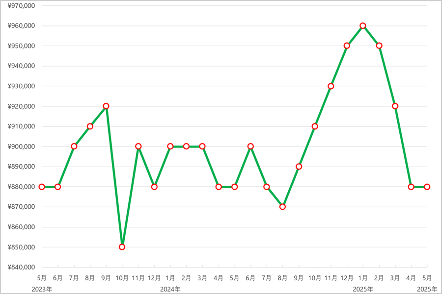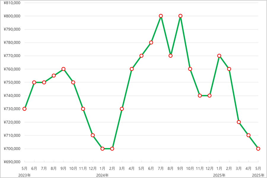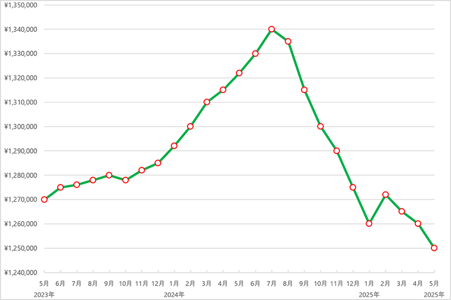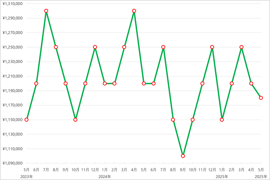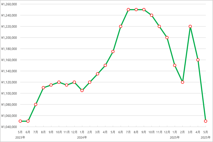 2023年6月まではおおむね105万円前後と安定した価格帯で推移しましたが、7月にやや上昇し108万円に。その後、9月〜12月にかけては111万円台で横ばいとなり、需要と供給のバランスが取れた穏やかな動きでした。