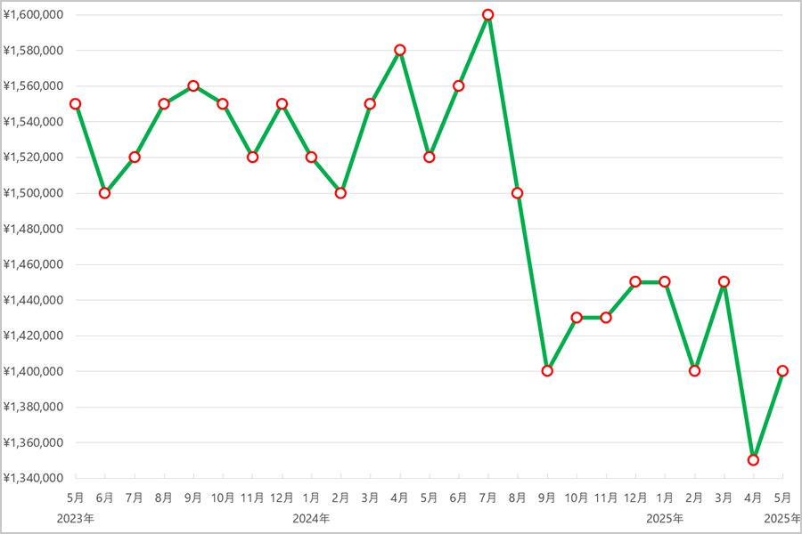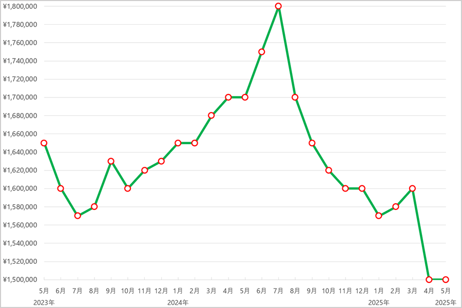 腕時計の注目度が増すサマーシーズンやボーナス時期の2023年7月と2024年7月には135万円とピークを記録しましたが、その後は反転し2024年10月までの3か月間で15万円も下落しました。2025年は上昇と下落を繰り返し、特に2025年4月から5月にかけては10万円の下落があり、130万円から120万円へと価格が落ち込みましたが、変動はあるものの常に高値で取引されています。